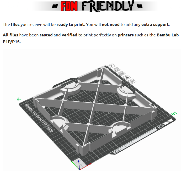 FDM friendly: These files have been optimized so that there is no need to use supports on them.